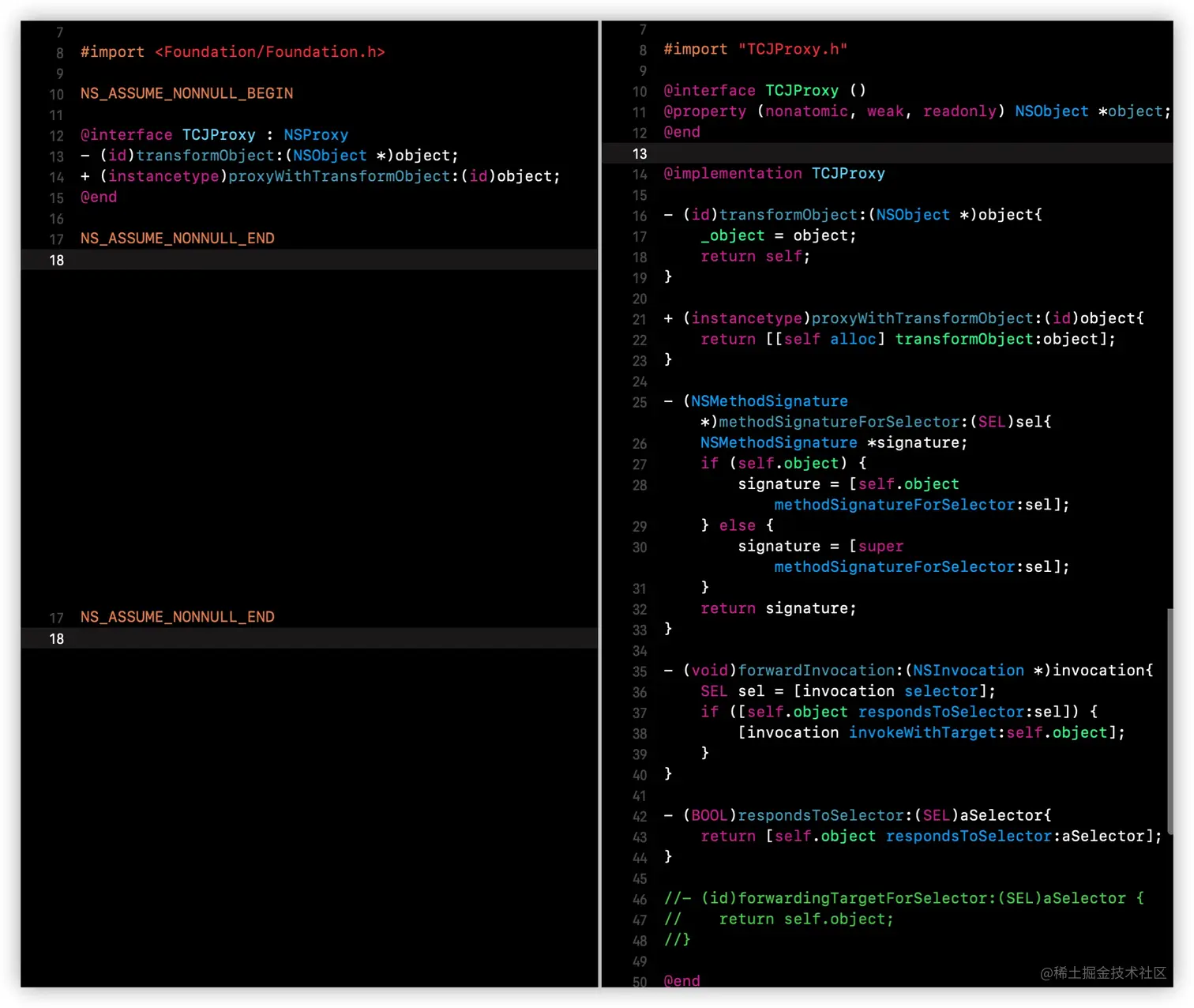 NSProxy其实是一个消息重定向封装的一个抽象类,类似一个代理人,中间件,可以通过继承它,并重写下面两个方法来实现消息转发到另一个实例- (void)forwardInvocation:(NSInvocation *)invocation; - (nullable NSMethodSignature *)methodSignatureForSelector:(SEL)sel