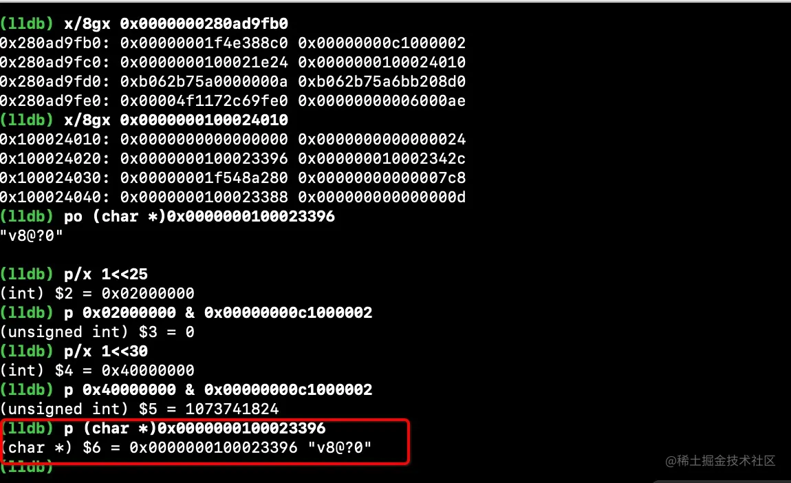x/8gx 0x0000000100024010, 查看descriptor的内存情况,其中第三个0x0000000100023396表示签名 -