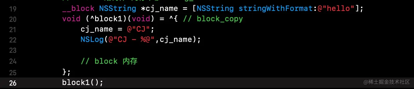 bref中取出相应对象cj_name,拷贝至block空间,才能使用(相同空间才能使用,不同则不能使用).最后通过内存平移就得到了cj_name,此时的cj_name和 外界的cj_name是同一片内存空间(从_Block_object_assign方法中的*dest = object;看出)