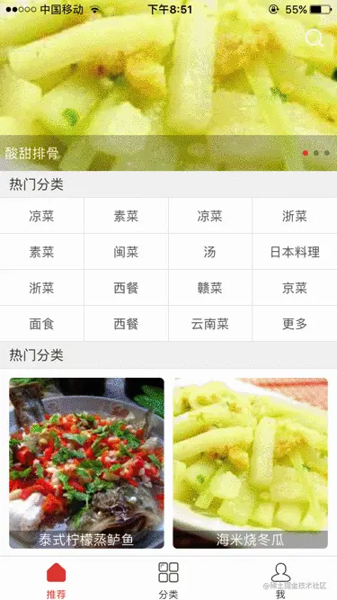 - 首页推荐菜谱列表,热门标签,轮播图显示热门推荐菜谱