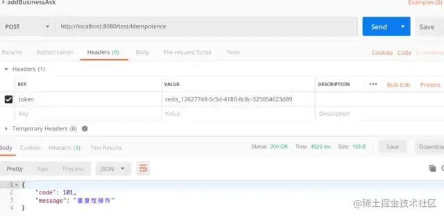 第二次请求,返回到是重复性操作,可见重复性验证通过,再多次请求到时候我们只让其第一次成功,第二次就是失败: