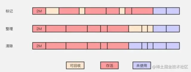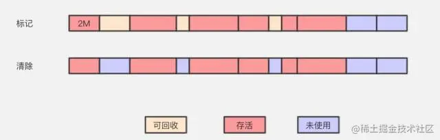 - 先在内存中把可回收的对象标记出来,再把这些垃圾清理掉变成未使用内存。