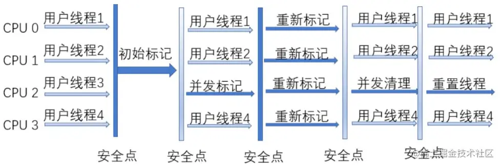 并发清除: GC 线程和用户线程同时运行,同时 GC 线程开始对为标记的区域做清扫,回收所有的垃圾对象。