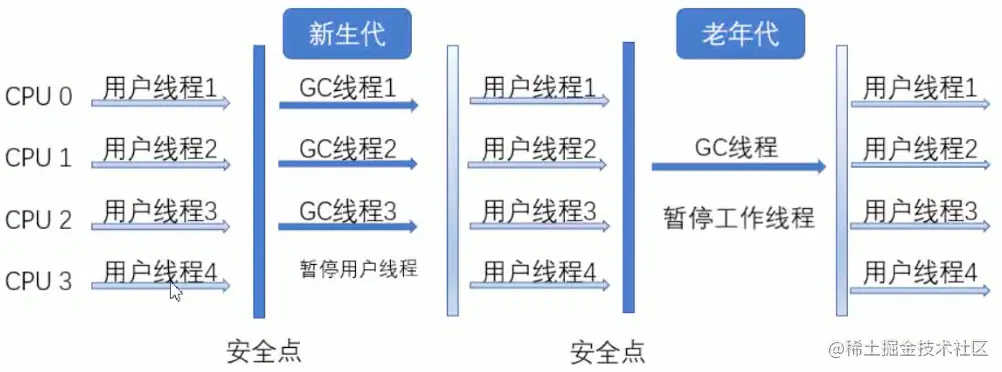 - 对 CPU 资源敏感:在并发阶段,它虽然不会导致用户线程停顿,但会因为占用了一部分线程(或者说 CPU 资源)而导致应用程序变慢,总吞吐量会降低。
