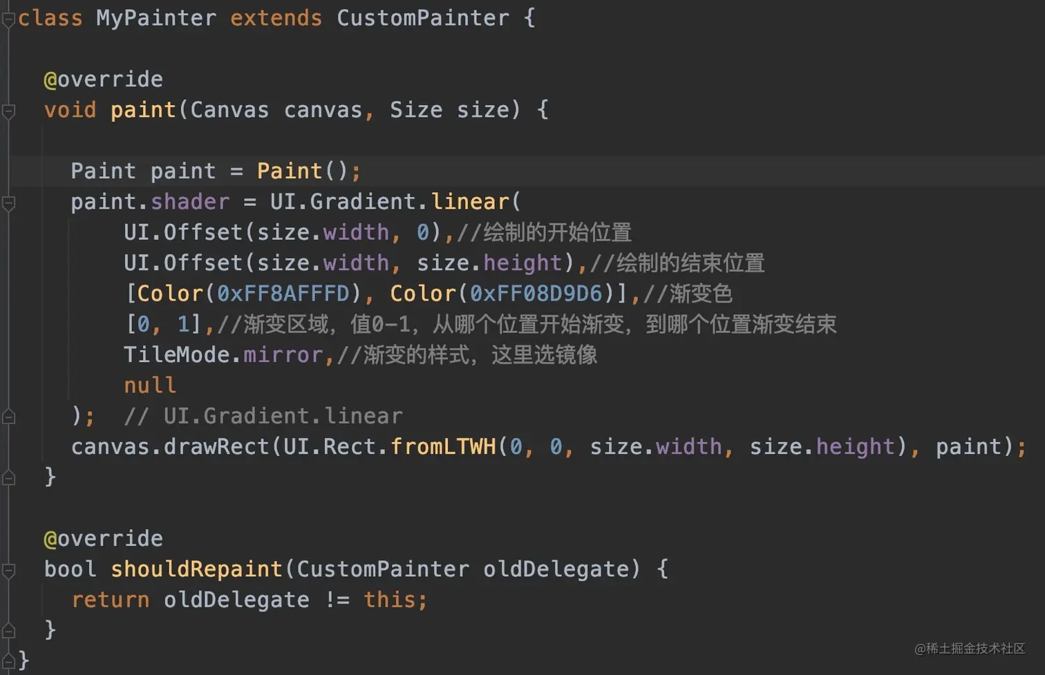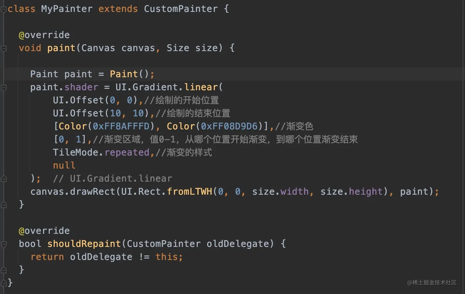 Flutter canvas 绘图设置渐变 wangfeng6075 2021-03-08 3,021 阅读1分钟 前段时间在自定义图表的时候,美工给的图表有渐变条,刚开始渐变没做出来,后来查阅资料才知道如何设置渐变条,在此分享给各位小伙伴 美工的效果图如下: 在网上没有找到太合适的第三方组件,就自己用Cancas 画的,主要是用CustomPaint、CustomPainter,渐变部分代码如下: ! 画出来效果图如下: 除了美工给出的这种效果,我们还可以改变值来实现其他效果: 这样就实现了一个条纹效果。