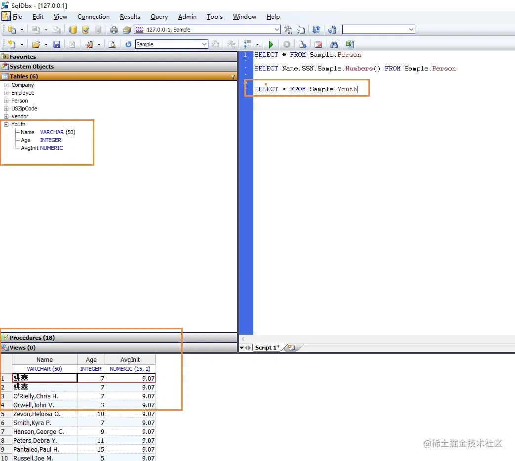下面的示例从Sample.Person复制“名称”和“年龄”字段,并创建一个AVG(Age)字段。这些字段定义用于创建名为Sample.Youth的新表。然后,该方法where Age < 21. 的那些记录的Sample.Person数据填充Sample.Youth。AvgInit字段包含创建表时所选记录的合计值。