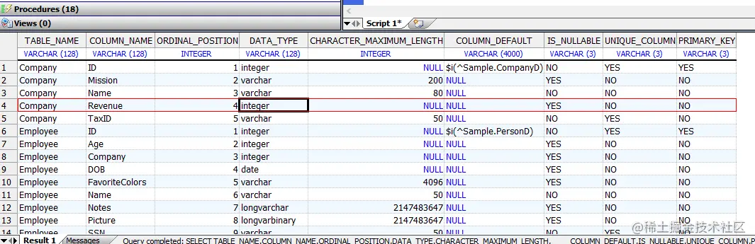 GetColumns()列出所有已定义的列,包括隐藏的列。如果表引用了嵌入式%SerialObject类,则GetColumns()首先列出持久性类中的所有列,包括引用%SerialObject的属性,然后列出所有%SerialObject属性。在下面的GetColumns()结果中显示了这一点: