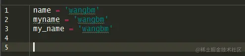 下面我先给出了一小段代码示例,思考一下,为什么name,my_name 不会有波浪线,而 myname 和 wangbm 会有波浪线呢?