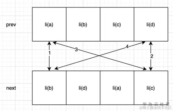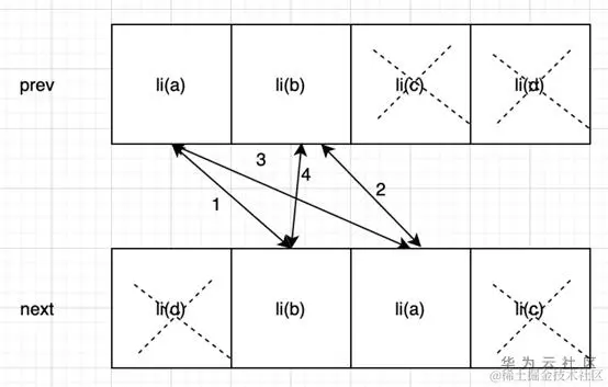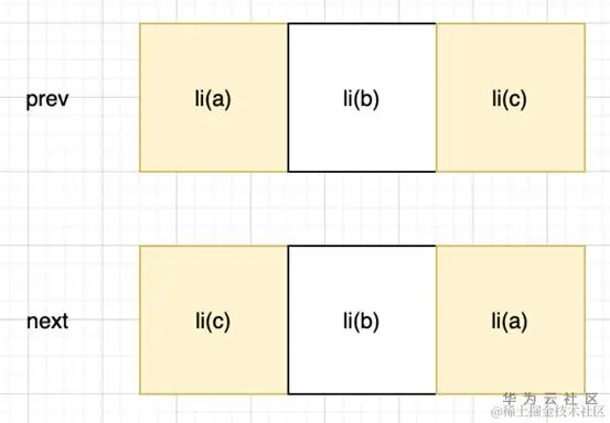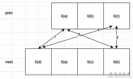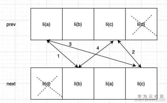 3. li(a) 和li (a),key相同,patch,把prev的li(a)移动到next的后面指针的元素的后面。