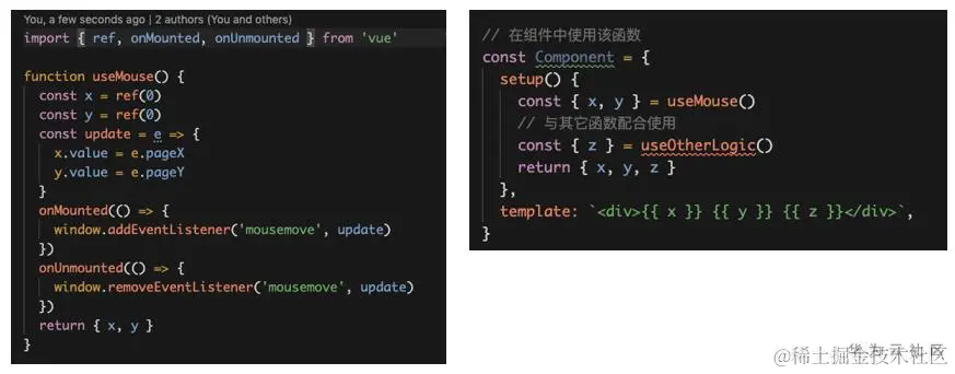 如果使用的是Vue3.0 的Composition,该怎么规避这个问题呢?如上图所示,假设它是一个组件实例,我们使用useMouse函数并返回了X和Y两个变量。从左边代码可以看到useMouse函数就是根,它监听了鼠标的移动事件之后,返回了鼠标的XY坐标。通过这种方式来组织代码,就可以很明确的知道这个函数返回的变量和改变的值。