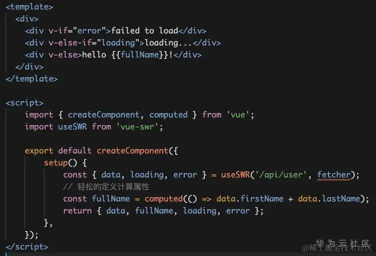 请求接口之后,直接拿到它的返回数据,然后把这个返回数据的值赋给computed函数里,这里就可以拿到full Name。通过这段代码可以看到,逻辑是更加的聚合了。