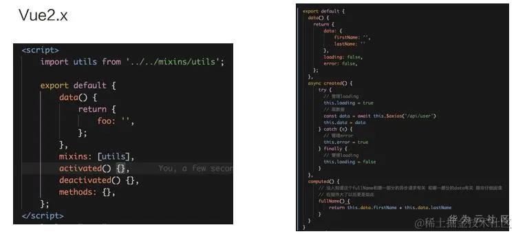 上图为Vue2.0的这段代码,左边是引入utils函数,然后把这个函数指为mixins。这一段代码是在Vue2里边是最常用到的,但这段代码是有问题的。