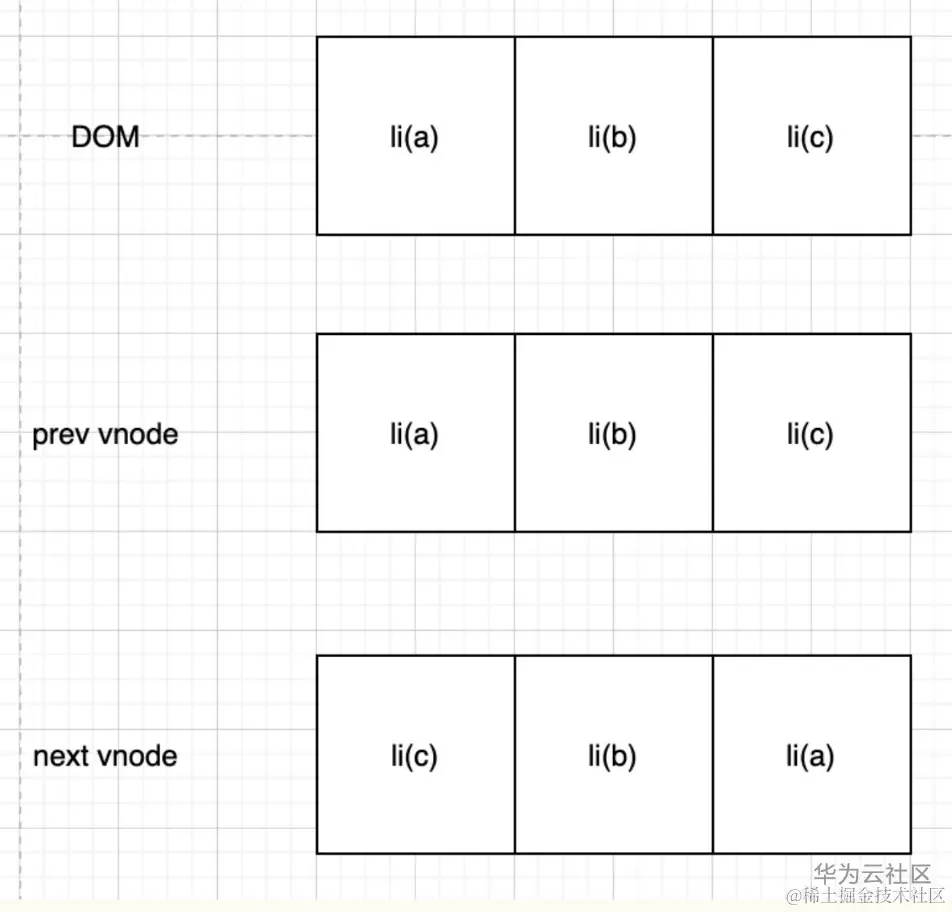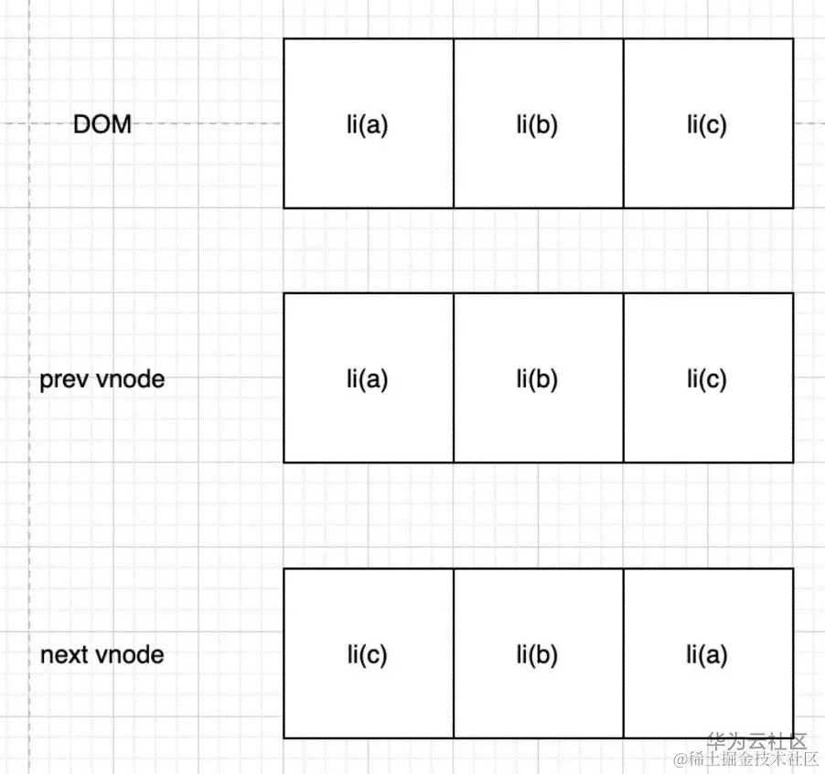 还是拿上面的例子,外层遍历next vnode,遍历第一个元素的时候, 第一个vnode是li©,然后去prev vnode里找,在最后一个节点找到了,这里外层是第一个元素,不做任何移动的操作,我们记录一下这个vnode在prevVnode中的索引位置lastIndex,接下来在遍历的时候,如果j<lastIndex,说明原本prevVnode在前面的元素,在nextVnode中变到了后面来了,那么我们就把prevVnode[j]放到nextVnode[i-1]的后面。