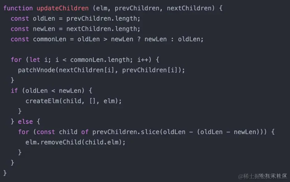 实现思路改成:先看看是旧的长度长,还是新的长,如果旧的长,我就遍历新的,然后把多出来的旧节点删掉,如果新的长,我就遍历旧的,然后多出来的新vnode加上。