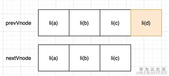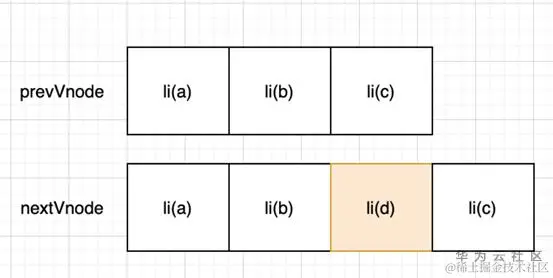 在prevVnode中找不到li(d),那我们需要调用createElm挂在这个新的节点,因为这里的节点需要超入到li(b)和li©之间,所以需要用insertBefore()。在每次遍历nextVnode的时候用一个变量find=false表示是否能够在prevVnode中找到节点,如果找到了就find=true。如果内层遍历后find是false,那说明这是一个新的节点。