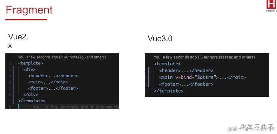 Fragment其实就是在Vue2的一个组间里边,它的template必须要有一个根的DIV把它包住,然后再写里边的you。在Vue3,我们就不需要这个根的DIV来把这个组件包住了。上图就是2和3的对比。