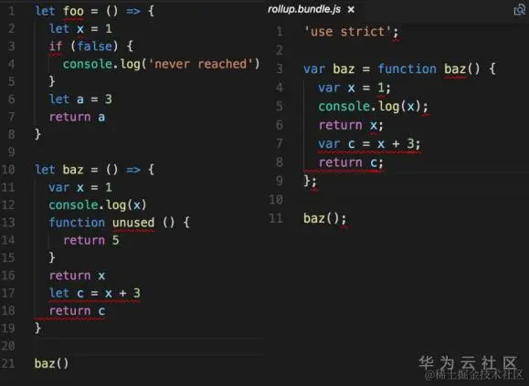 如上图示例,左边是开发的源码提供的两个函数,但最终只用到了baz函数。在最后打包的时候,会把foo函数去除掉,只把baz这个函数打包进浏览器里面运行。Tree Shaking是消除死代码的一种方式,更关注于无用模块的消除,消除那些引用了但并没有被使用的模块。