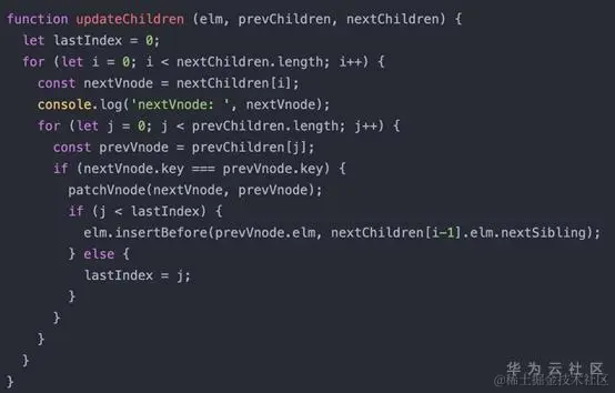 这里多说一句,dom操作的api里,只有insertBefore(),没有insertAfter()。也就是说只有把某个dom插入到某个元素前面这个方法,没有插入到某个元素后面这个方法,所以我们只能用insertBefore()。那么思路就变成了,当j<lastIndex的时候,把prevChildren[j]插入到nextVnode[i-1]的真实dom的后面元素的前面。