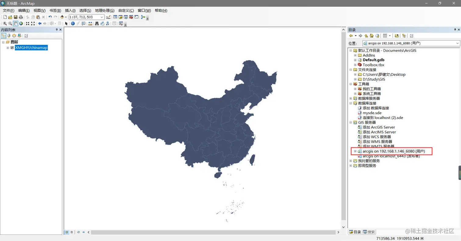 在ArcMap桌面端软件中,添加Server服务站点,就可以查看该Server站点下的所有地图服务
