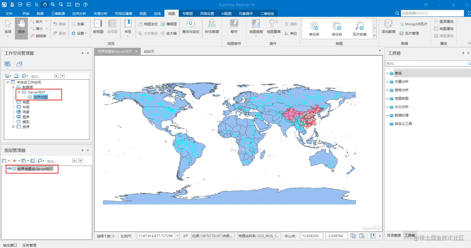 打开Supermap iDesktop,选择添加web型数据源,将地图服务添加到工作空间,就可以查看到该地图服务下的地图。