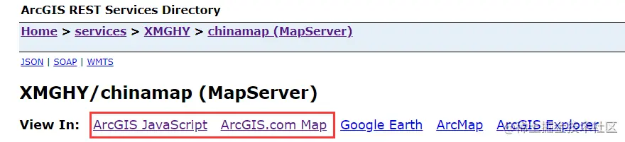 打开ArcGIS Server 的地图服务地址,可以通过ArcGIS API for JS 或 ArcGIS OnLine 查看地图服务。