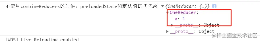 let preloadedState={OneReducer :{OneReducer:1}} store = createStore(Reducers, preloadedState)//Reducers就是上边定义的类组件 store.subscribe(()=>{ console.log( "使用combineReducers的时候。preloadedState和默认值的优先级", store.getState()) })//onereducer