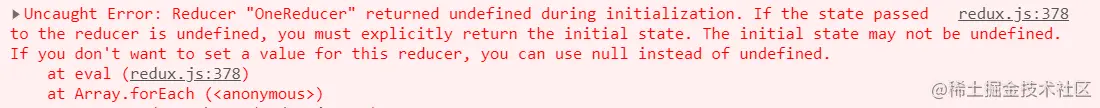 此时还没有使用默认值, 所以redux内部会报异常如下