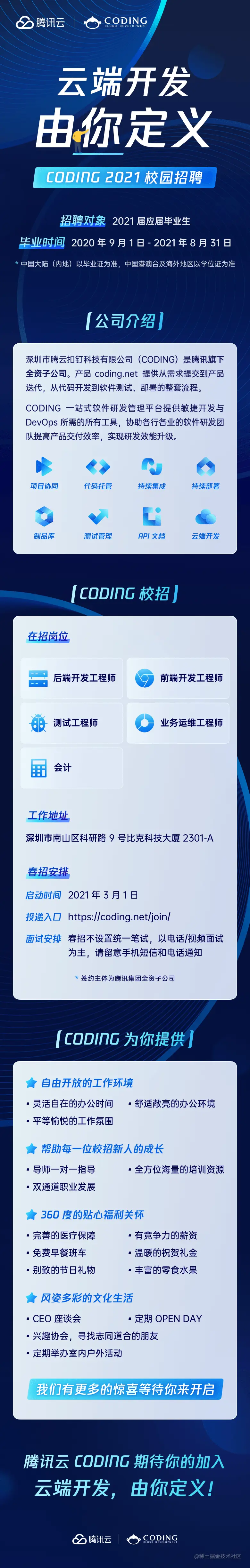 腾讯全资子公司 CODING 2021 届春季校招补录全面启动!