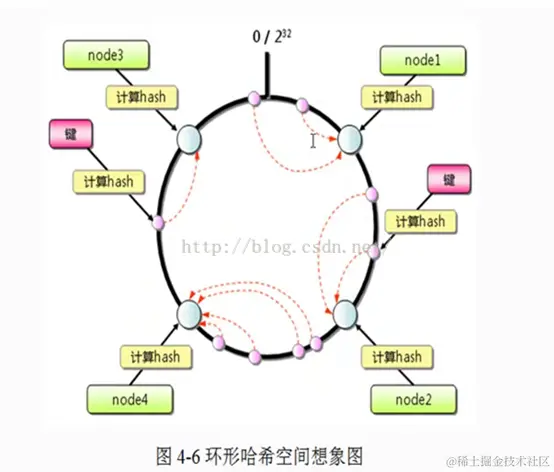 通常的hash算法都是讲value映射到一个32位的key值,既0-2^32-1次方的数组空间;可以将这个空间想象成一个首(0)尾(2^32-1)相接的圆环,如下面图所示: