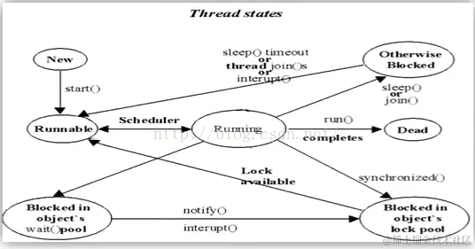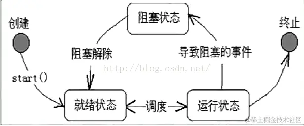 新生--> start -->就绪-->运行-->阻塞-->终止