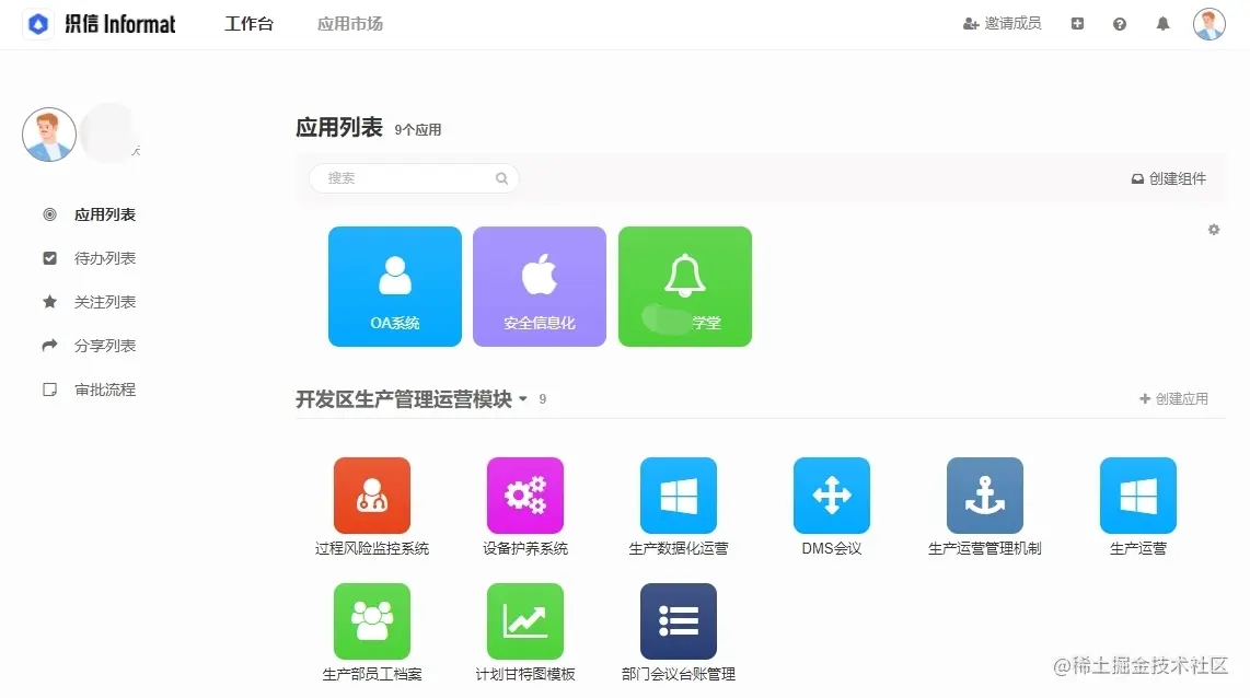 合理并且有效地运用低代码开发平台,不仅可以让我们工作高效地运行,还能最大程度保证团队目标的达成。我推荐使用织信Informat,它内置了100+的应用模板,覆盖OA、ERP、CRM、生产、人事、企业服务、个人及组织等多个应用场景。(如下图)