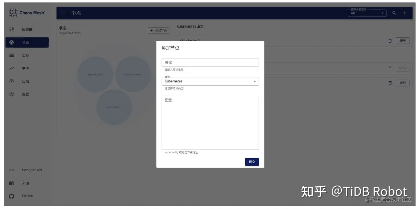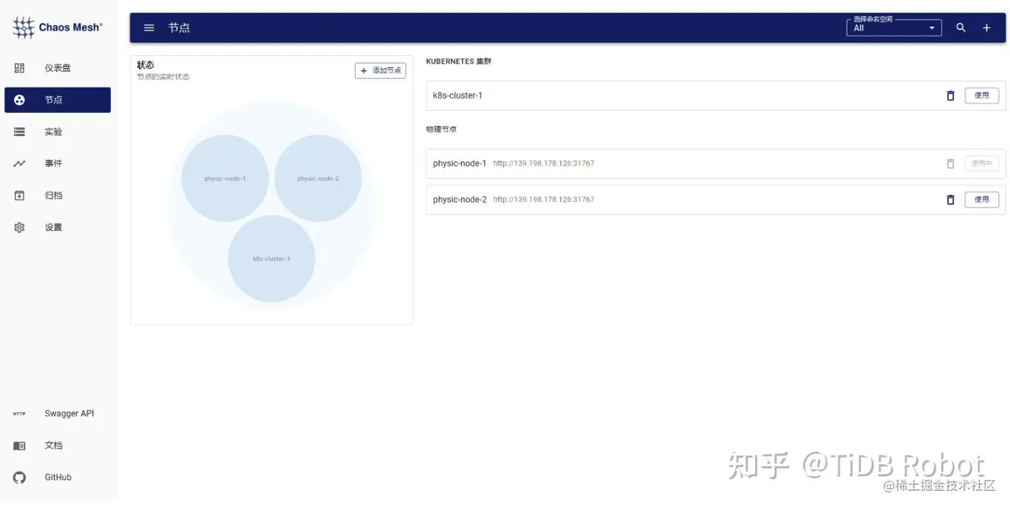 Chaosd 可以通过配置主动向 Dashboard 注册,增加 heartbeat 机制,在注册到 Dashboard 后,定期向 Dashboard 发送心跳,方便 Dashboard 维护 Chaosd 节点状态。同时,也可以使用 Dashboard 界面添加 Chaosd 节点。