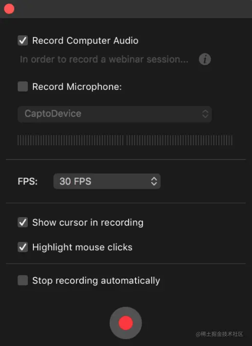 开始举例,选择全屏录制后,屏幕进入待命状态,此时你可以选择许多设置,比如选择录制声音,录制设备外放声音(需要安装组件)、选择录制时显示光标,并高亮显示光标点击动作、Fps 最大值可达 60,按 CMD+Shift+Esc 可关闭录制。
