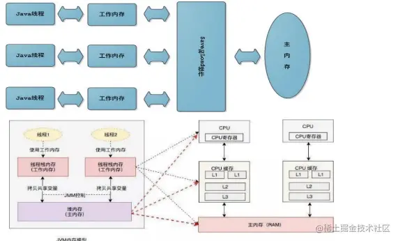 从抽象的角度来看,JMM定义了线程和主内存之间的抽象关系:线程之间的共享变量存储在主内存(Main Memory)中,每个线程都有一个私有的本地内存(Local Memory),本地内存中存储了该线程以读/写共享变量的副本。本地内存是JMM的一个抽象概念,并不真实存在。它涵盖了缓存、写缓冲区、寄存器以及其他的硬件和编译器优化,