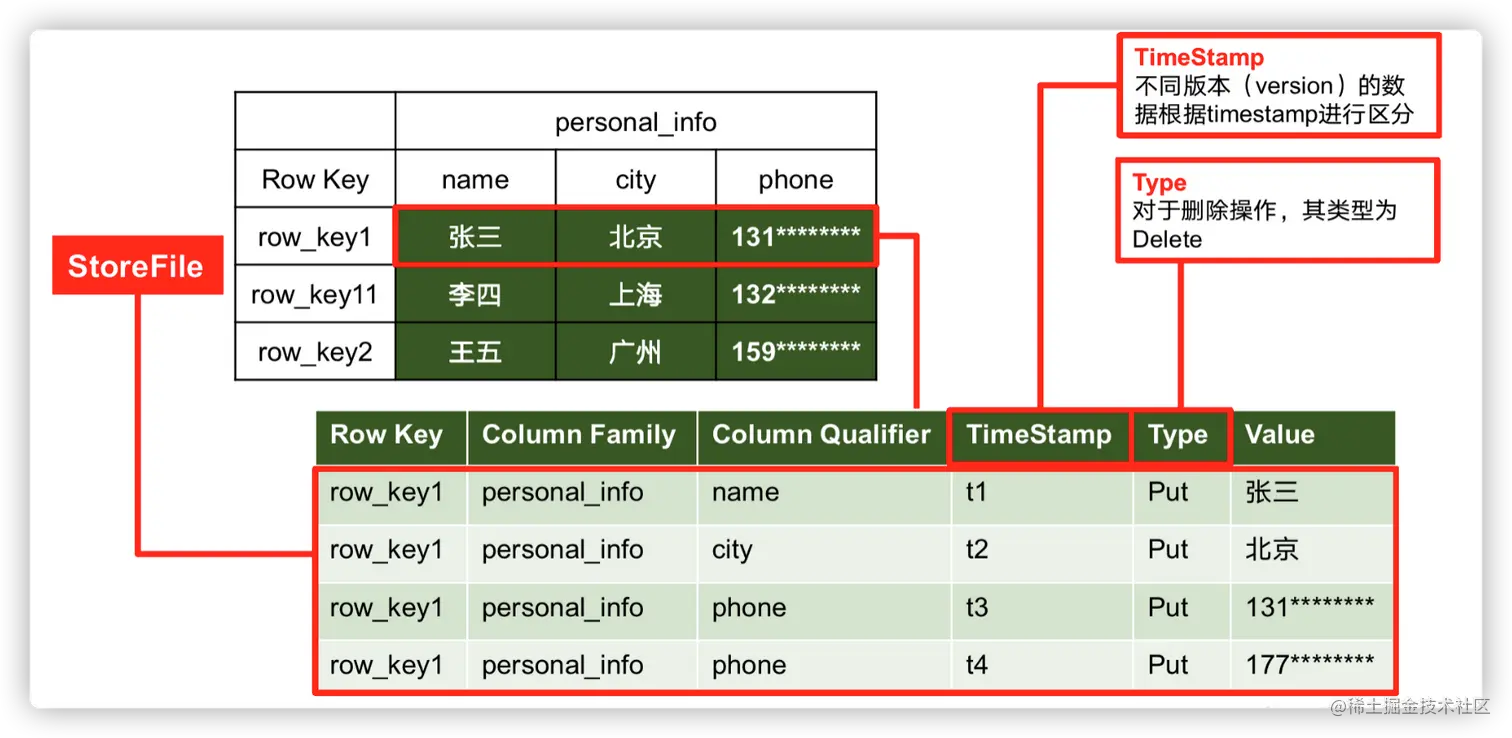 Time Stamp 用于标识数据的不同版本(version),每条数据写入时,如果不指定时间戳,系统会自动为其加上该字段,其值为写入HBase的时间。