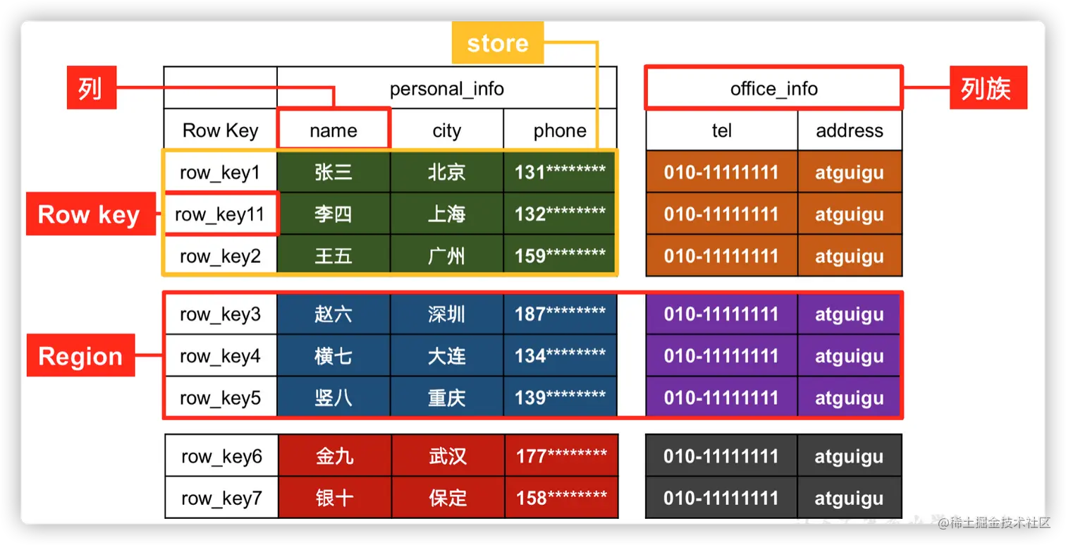 逻辑上,HBase的数据模型同关系型数据库很类似,数据存储在一张表中,有行有列。但从HBase的底层物理存储结构(K-V)来看,HBase更像是一个multi-dimensional map。
