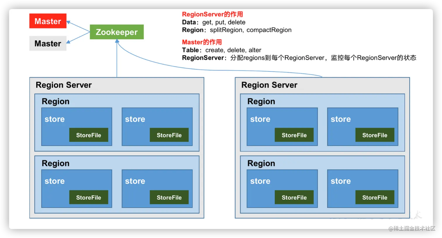 Master是所有Region Server的管理者,其实现类为HMaster, 主要作用如下: