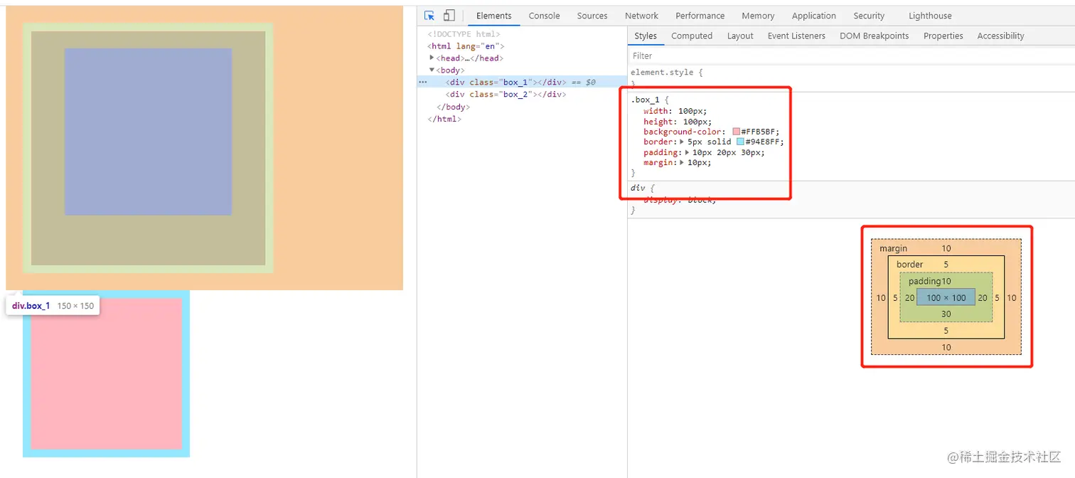 在 .box_2 的效果图中,我们可以看到盒子的大小等于元素的 width、height 值。在 IE 盒模型中,border 和padding 的空间会挤压 content 的空间,使得元素的内容宽高小于 width、height 设置的值(100px)。