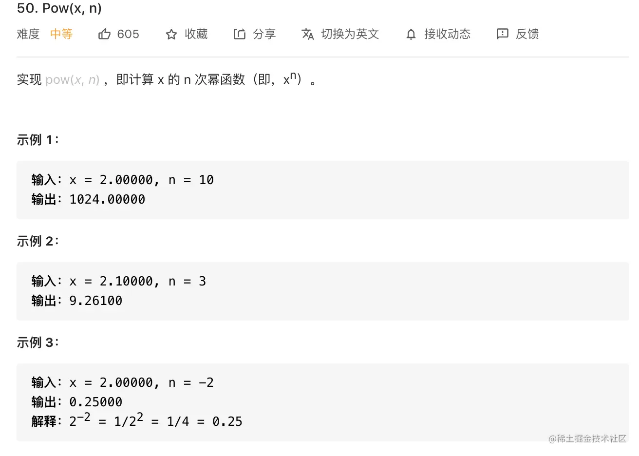 举例算x的4次方可以等于x的2次方乘以x的2次方x^4=x^2*x^2那么x的5次方就是在前面的基础上再乘以x。故如果n次方n是偶数时递归的调用,每次是n=n/2。就是myPow(x * x, n / 2)如果是奇数x * myPow(x * x, n / 2)再乘以x本身就好。如果n<0的时候x=1/x。n=-n由于有溢出代码中n=-(n+1)。