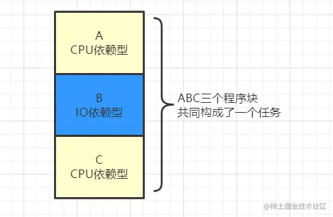其中A:重CPU逻辑运算,轻IO;B:重IO,轻CPU逻辑运算;C:重CPU逻辑运算,轻IO;按照原有的批处理程序运行的原则,依次加载A、B、C后,运行到B程序时,因为IO导致CPU长时间处于阻塞态等待外设返回结果,而这造成了CPU资源的极大浪费,并且使得C程序一直处于等待运行状态,当前Job都处于等待外设返回状态。 因此我们需要对Job这个概念进行更细粒度的拆分(进程拆分线程亦是这个思路),我们把当前Job分为三个进程,并实现当CPU因为外设中断而陷入阻塞状态时,CPU可以被切换到执行C程序(进程的调度);