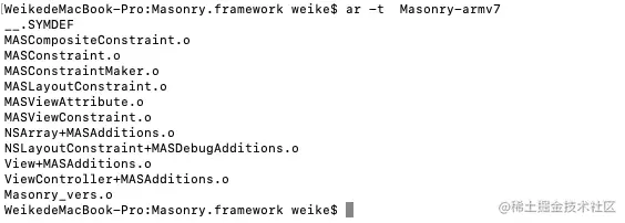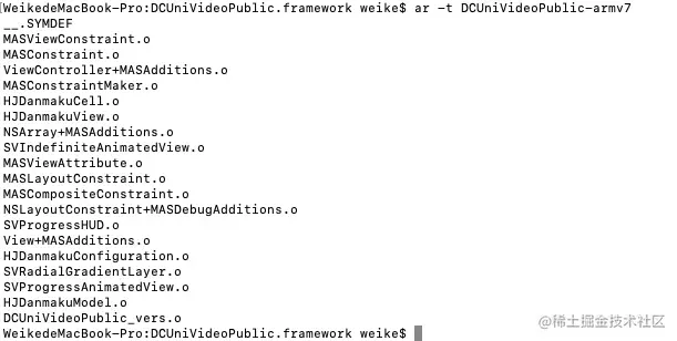 如果不清楚两个sdk都有哪些文件重复,可以按照以上步骤,查看下另一个重复的sdk都包含哪些文件,如下所示和Masonry.framework重复的DCUniVideoPublic.framework分离出armv7架构的文件列表,其实也可以在xcode编译重复信息里面找到相关.o文件,看个人喜好。