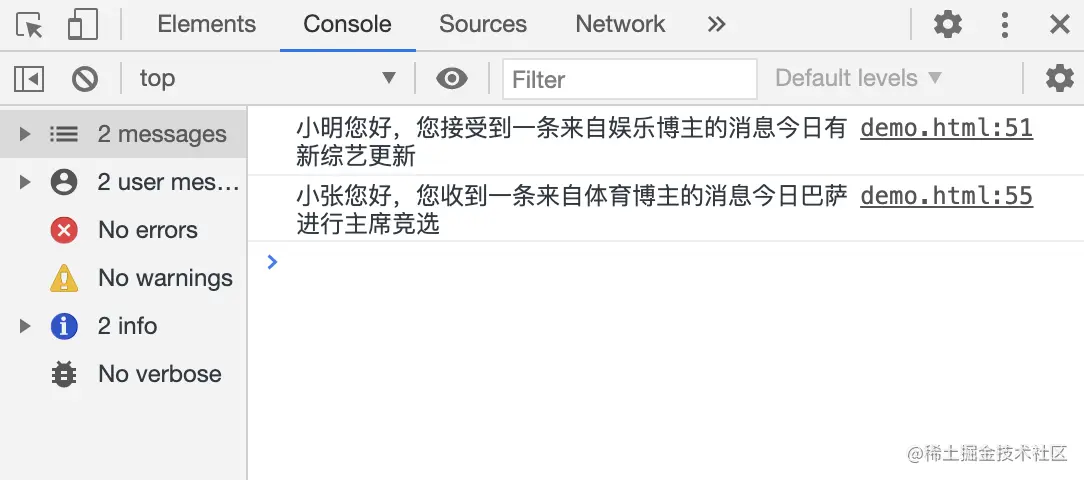 console.log('小明您好,您接受到一条来自娱乐博主的消息' + data)