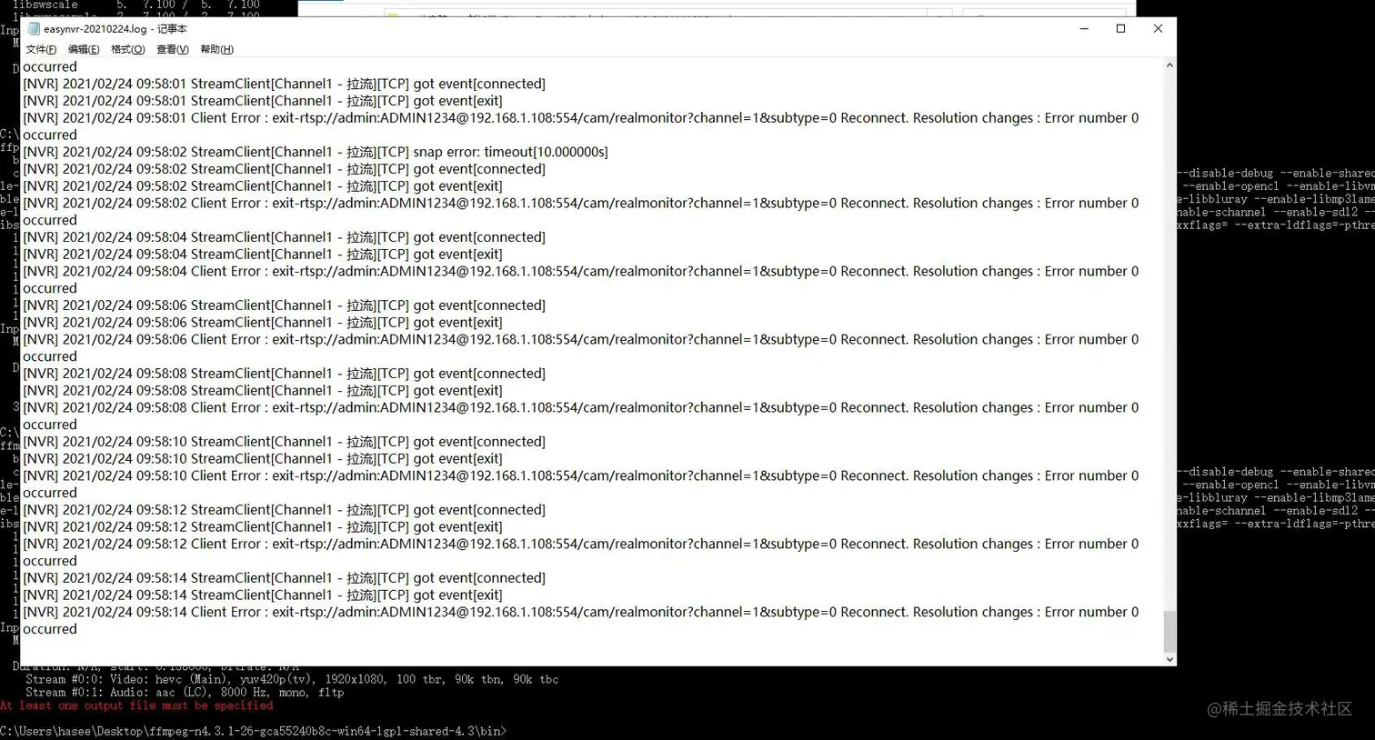 EasyNVR接入摄像头都是同一个rtsp地址,所以可以排除由于地址填错导致无法拉取到视频流的情况。因此我们测试使用ffplay命令行对摄像头rtsp流进行播放,发现都可以正常播放,同时使用ffmpeg命令行对摄像头流进行信息查看,也都可以获取到摄像头流各种数据。
