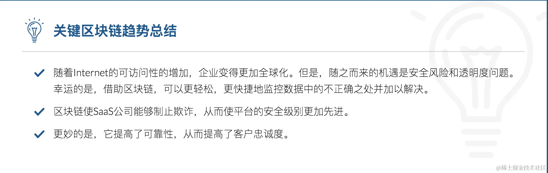 最重要的是,区块链可以帮助SaaS公司构建万无一失的系统,并避免传统数据库通常面临的安全挑战。更好的是,区块链可以增强业务可靠性,从而提高客户忠诚度。