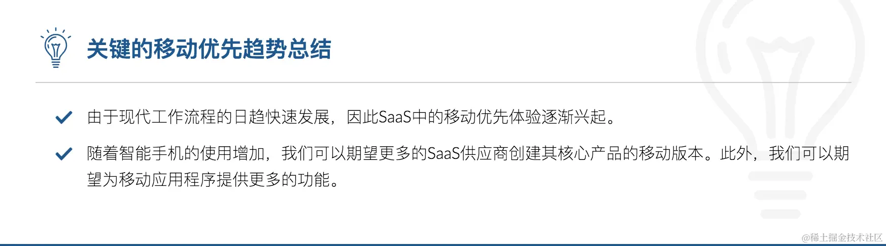 移动体验趋势已经开始,因此,我们希望SaaS公司继续为其工具和服务创建和改进移动应用程序。迫切需要更快地发展,以跟上移动技术的步伐和方向,我们预计这一趋势将持续到2021年。
