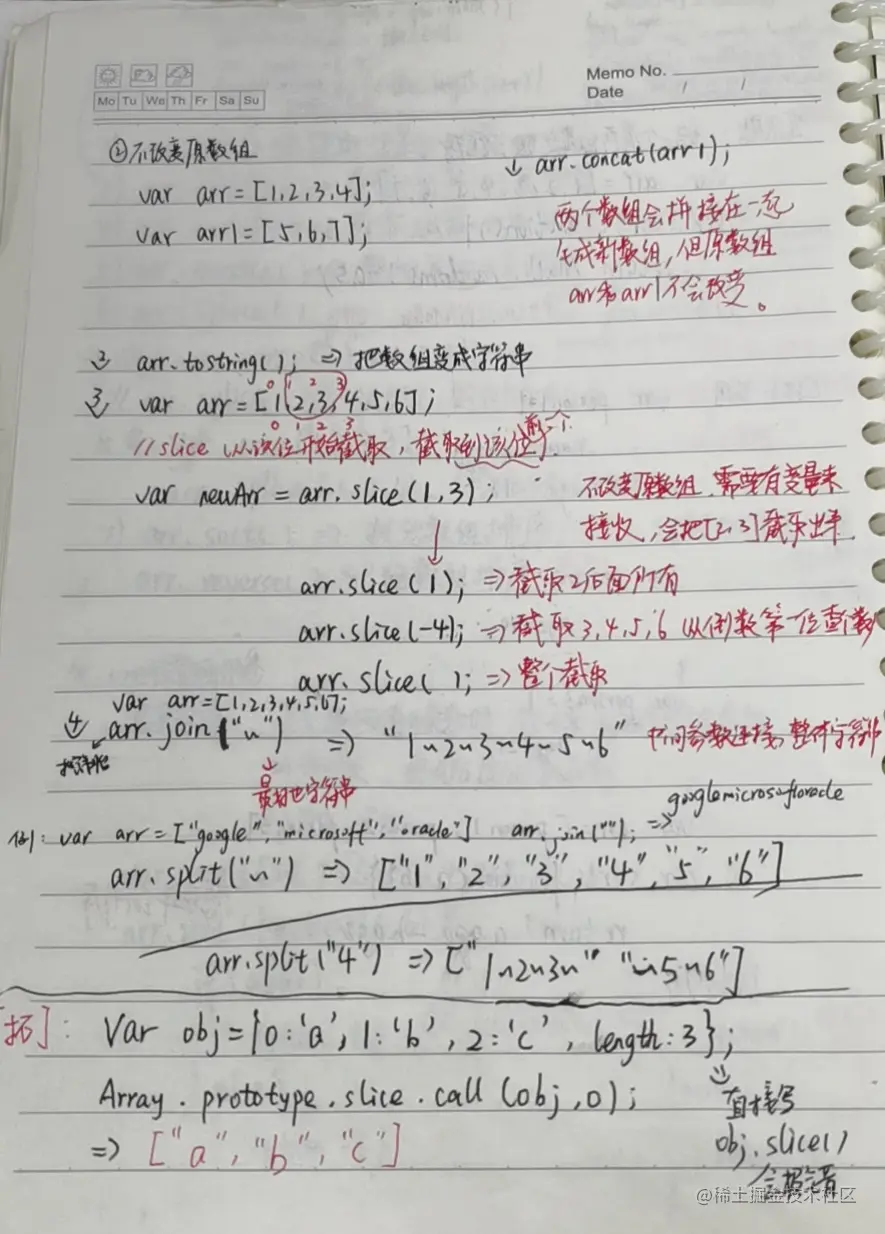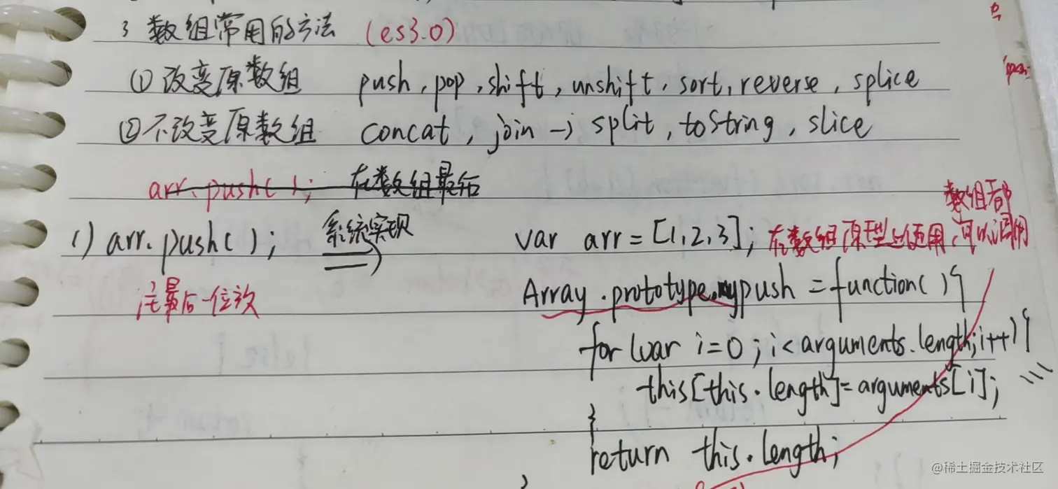 第一部分的数组基础知识是我早期以笔记的形式进行书写,字迹可能会比较潦草,大家看不懂的话请见谅,哈哈。第二部分是从es6到es10的近期数组的相关扩展,后期如果还有什么关于数组的新知识,我会在这里及时更新的。拓展的第三部分和第四部分则分别是对数组的遍历方式和拷贝方式进行的一个总结,方便大家对整体有一个清晰的认识。第五部分则是我自己又重新读了一遍阮一峰的es6的一些心得体会,大家不敢兴趣的可以忽略不计,只是自己的一个平时的记录。