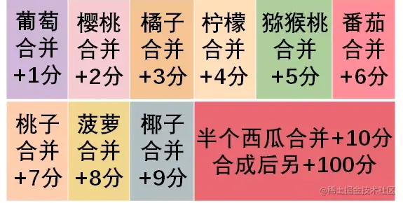 每次合成新水果都会得分,按顺序的话第一种是 1 分,第二种 2 分,第 10 种就是 10 分,最后合成大西瓜后是额外得 100 分: