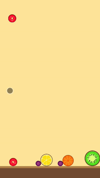 首先简单介绍下游戏的玩法:控制水果从上方掉落,两个相同水果会合成一个更大的水果,最终合成一个大西瓜,效果展示: