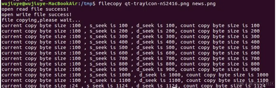 # 由于笔者将编译后的可执行文件filecopy保存在“/home/wujiuye/桌面/c_projects/linux/file”下