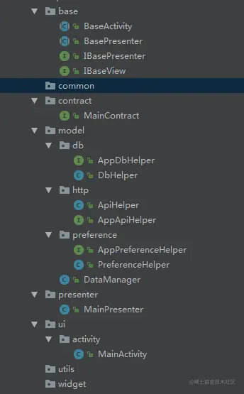 MainContract 作为契约类,主要有两类接口,第一、封装了 Presenter 持有 View 层的接口,方便View层更新界面, 第二 、Presenter 所要实现的model 层数据回调的接口。 model 层会持有 presenter 的对象以便数据的回调。